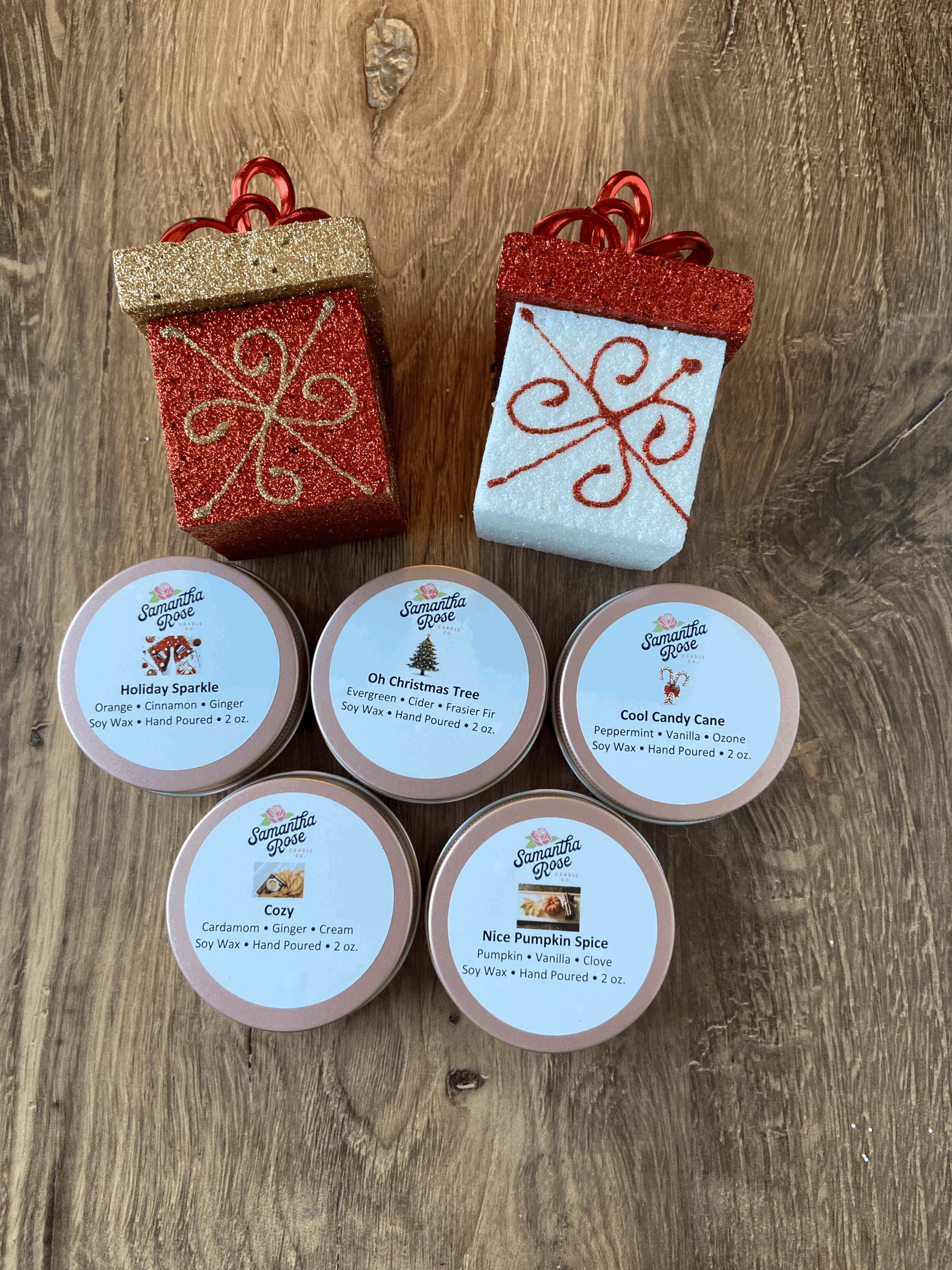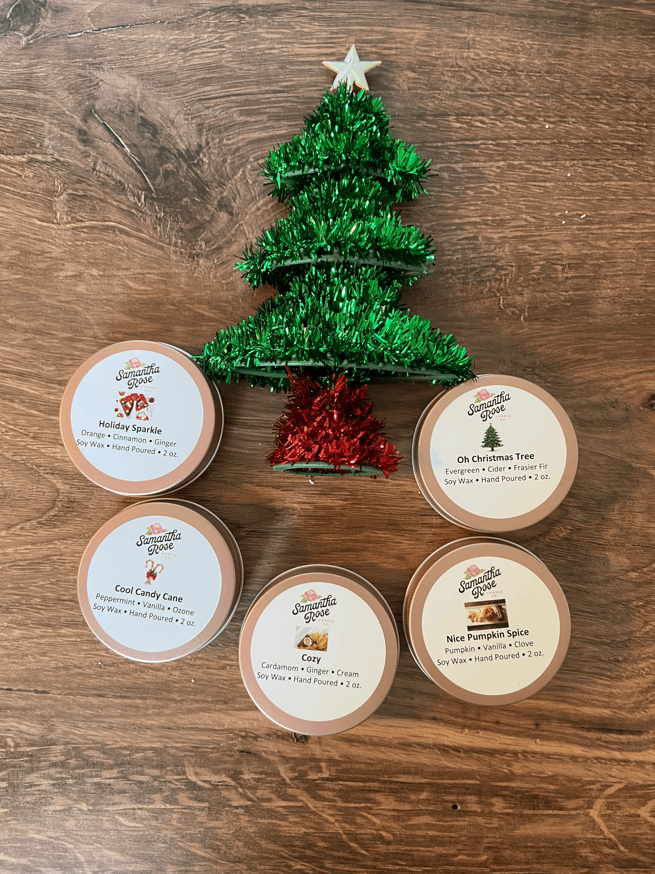 Not sure which scent will be your favorite? Then try out our holiday candle sample pack that includes 2-ounce candles of Cool Candy Cane, Holiday Sparkle, Oh Christmas Tree, Cozy and Nice Pumpkin Spice. All of these scents come packaged together and can’t be substituted.